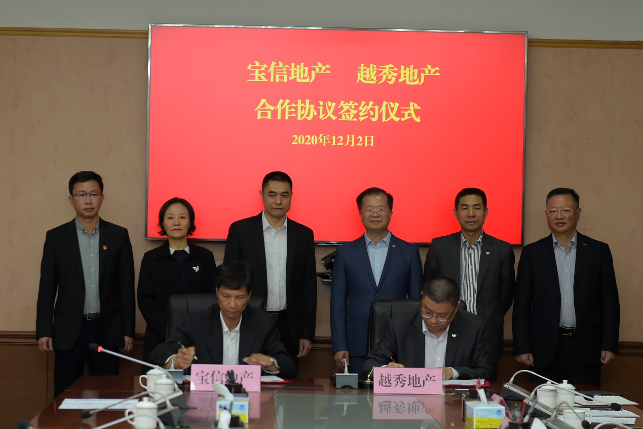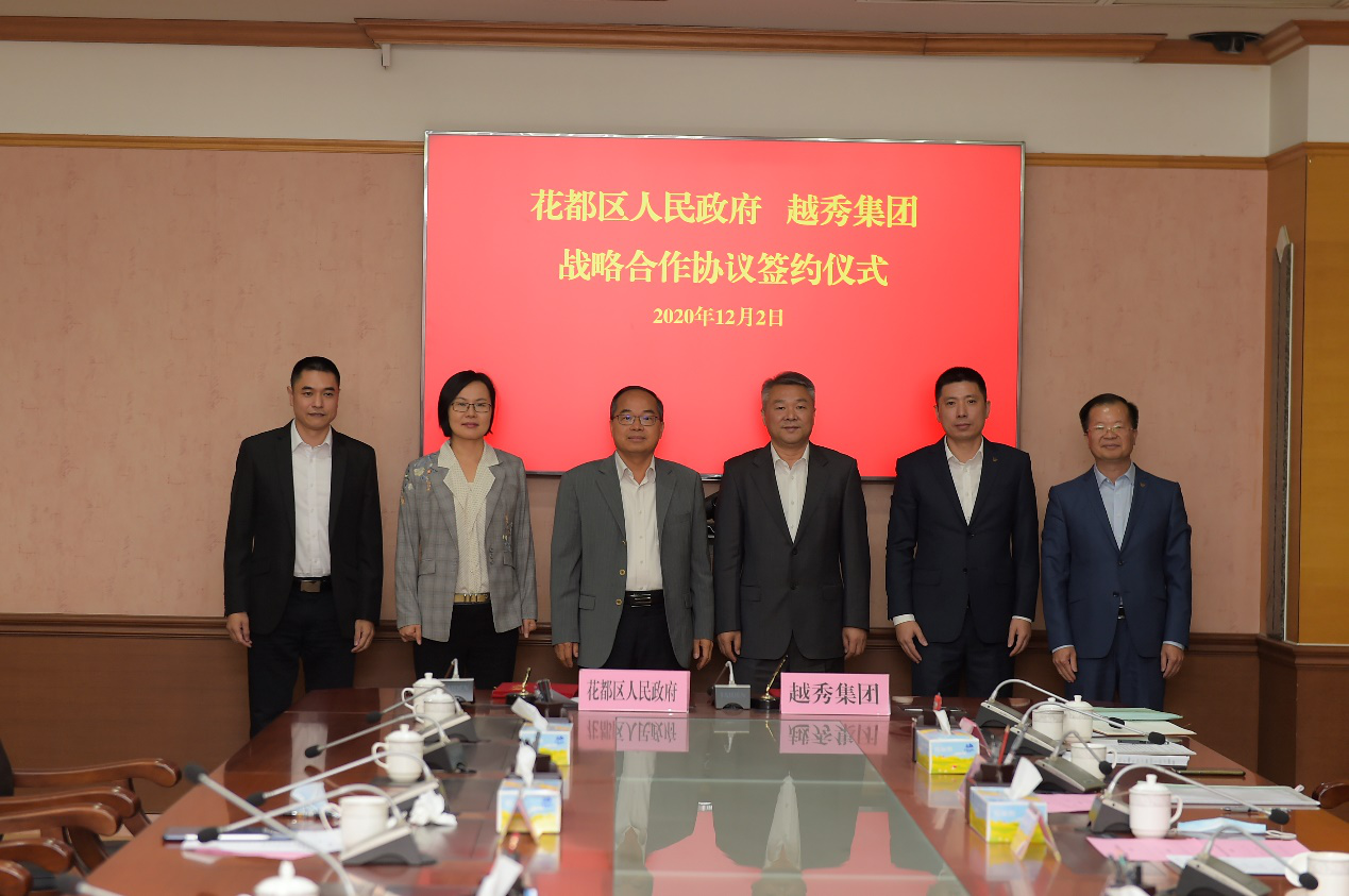 2020年12月2日下午,越秀集团与广州市花都区人民政府在花都区委区政府大楼举行战略合作签约仪式。按照战略合作协议约定,双方将在城市更新、综合开发、基础设施、金融服务、农业食品、乡村振兴等多领域开展全方位、深层次合作。越秀集团旗下越秀地产与花都区属国企宝信地产同步签署合作协议。