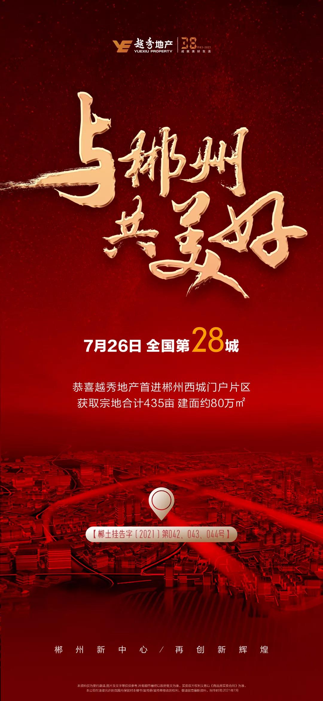 7月26日,越秀地产成功摘得湖南郴州市郴土挂告字〔2021〕第042043044号地块,实现落子郴州。这是越秀地产拓展华中区域市场的重要步骤,更是越秀地产“1+4”全国化布局战略的进一步深化与完善。