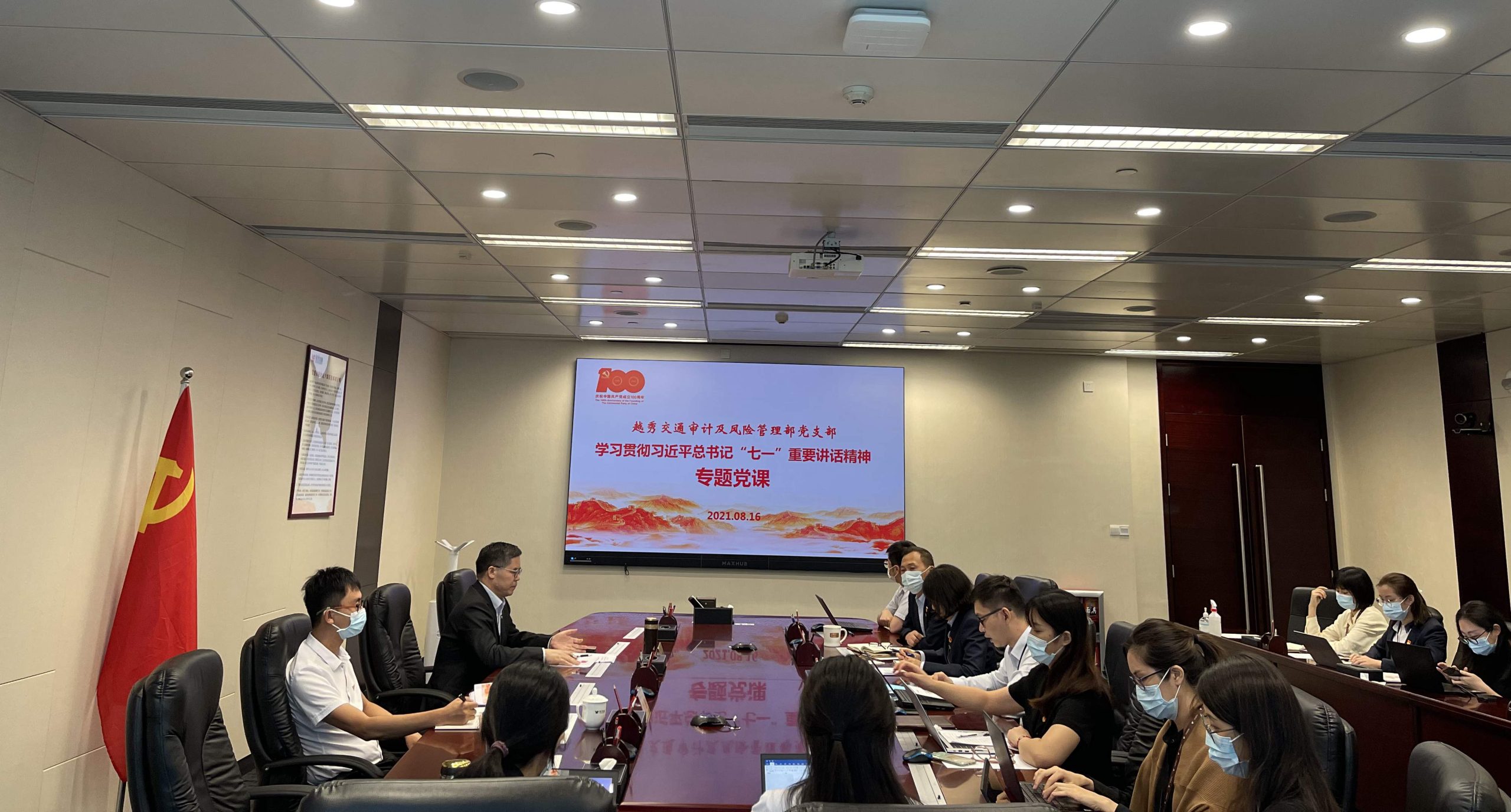 集团管理咨询协调委员会主任委员助理、越秀交通党委书记、副董事长、总经理何柏青为越秀交通审计及风险管理部党支部讲授《深入学习贯彻习近平总书记在庆祝中国共产党成立100周年大会上的重要讲话精神》专题党课,对“四个伟大成就”“九个必须”等方面进行系统解读,号召全体党员坚持服务生产经营不偏离,以公司战略发展成果检验党建工作成效。随后,2位党员代表结合本次党课学习及自学情况进行心得分享。