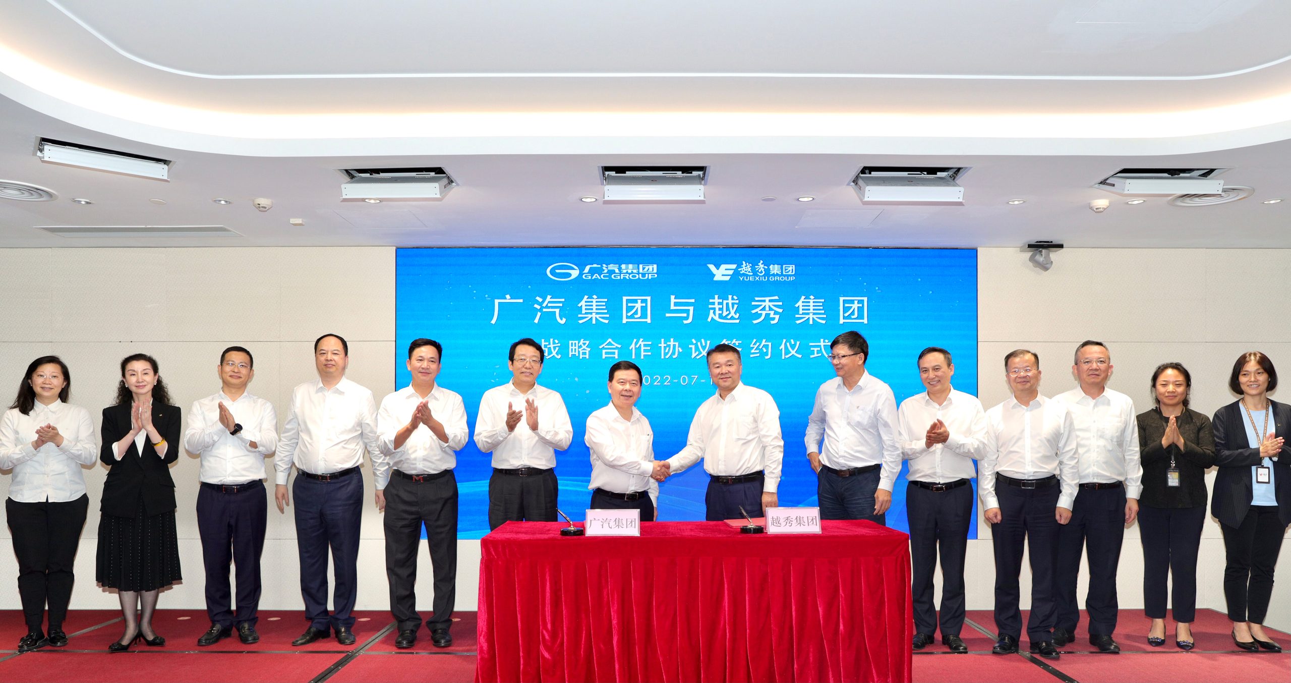 7月12日,越秀集团与广汽集团在广州国际金融中心举行战略合作协议签约仪式。广汽集团党委书记、董事长曾庆洪,越秀集团党委书记、董事长张招兴见证签约仪式,越秀集团管理咨询协调委员会副主任委员林昭远与广汽集团副总经理閤先庆代表双方签署战略合作协议。根据协议,双方将在产业地产运营、金融服务、市场拓展、品牌推广等领域展开全面战略合作,实现优势互补、合作共赢。